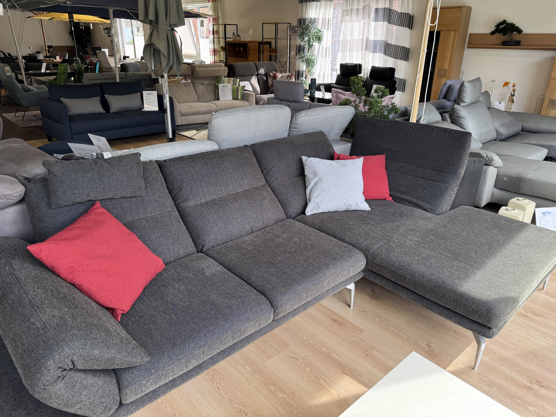 Polstergarnitur TL 2380_Livaso Polsterung: Memory sandwich Bezug: 4 Carmen graphite Metallfuß gebürstet 2,5-Sitzer 1.815,-€ Armlehne links, klappbar (+ca.31cm) Rücken verstellbar Kopfteil verstellbar B:180;T:92;H:90;SH:42;ST:59 cm Longchair 1.779,-€ Armteil rechts,klappbar (+ca31cm) Rücken verstellbar Kopfteil verstellbar B:120;T:170;H:90;SH:42;ST:129cm Benötigter Wandabstand: ca. 35cm Gesamtstellmaß: 300x170cm Kopfauflage 76,-€ B:48;H:25;T:5cm Gesamtpreis: 3.670,-€ Jetzt nur 1.999,-€