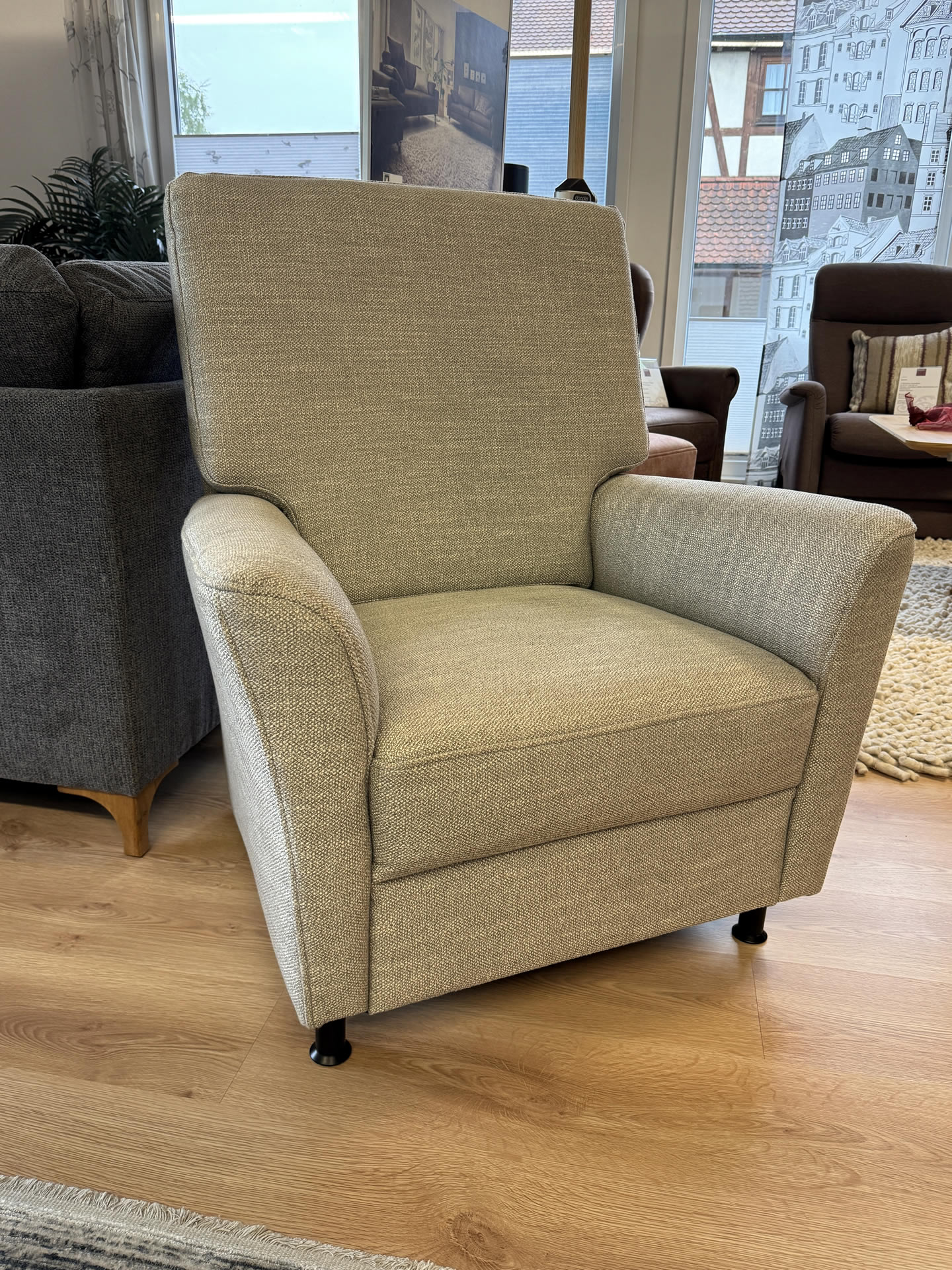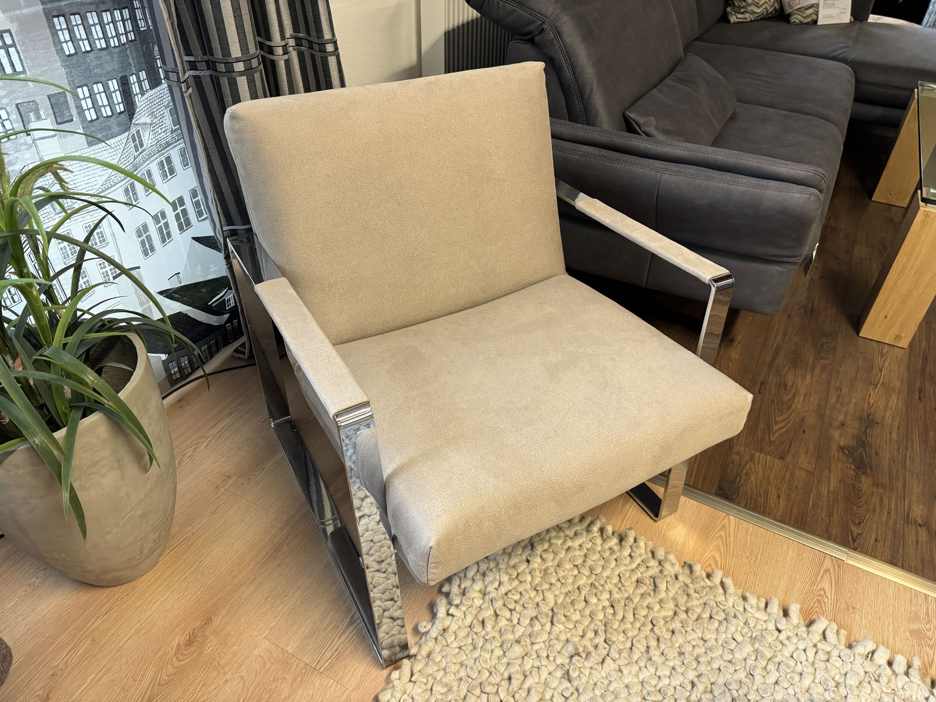 Einzelsessel Bezug: Siesta taupe PG: 8 Sitz: PUR-Schaum, dauerelastische Stahl-Wellenfedern Fuß: Metall ( chrombeschichtet ) 2 Armlehnen SH: 45 cm; ST: 52; H. 82; T: 80 Abverkauf 679,-€